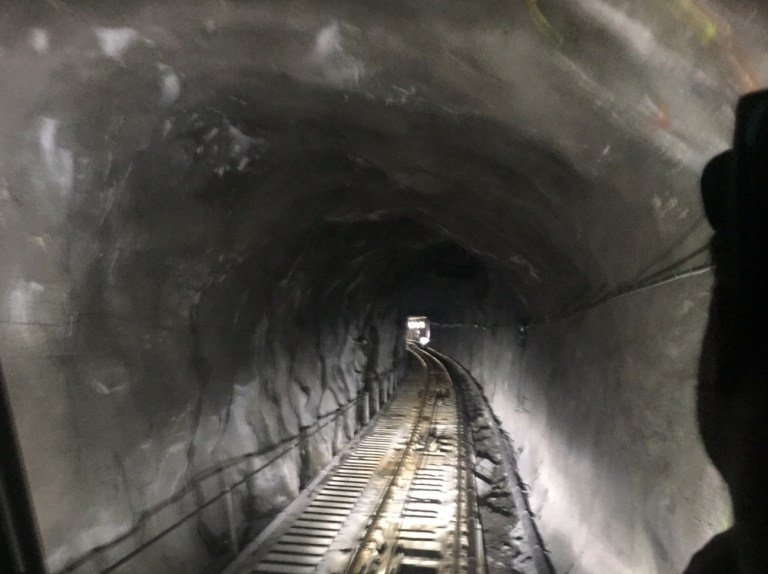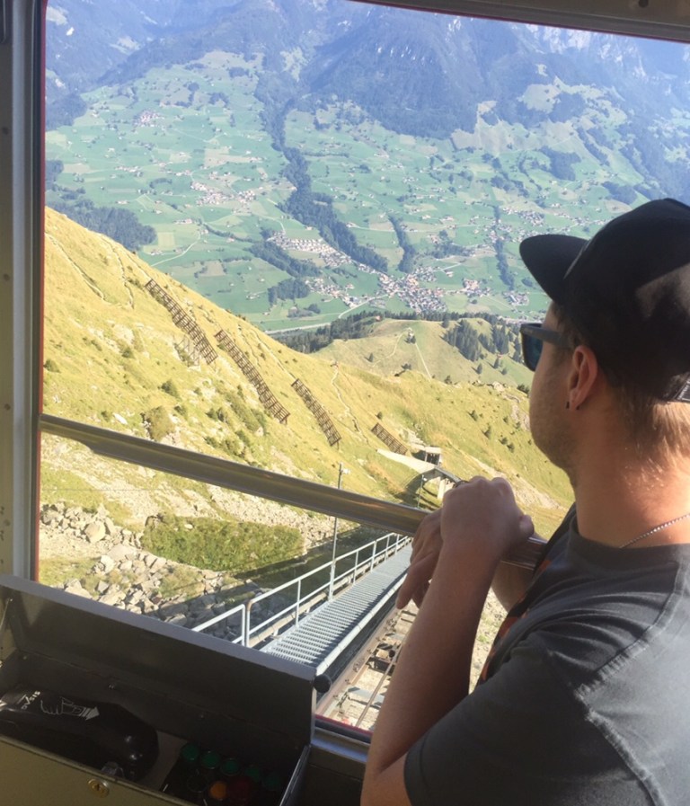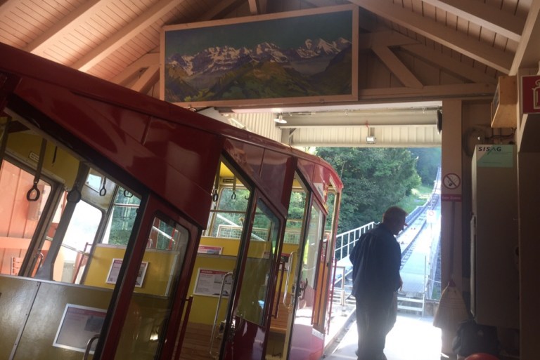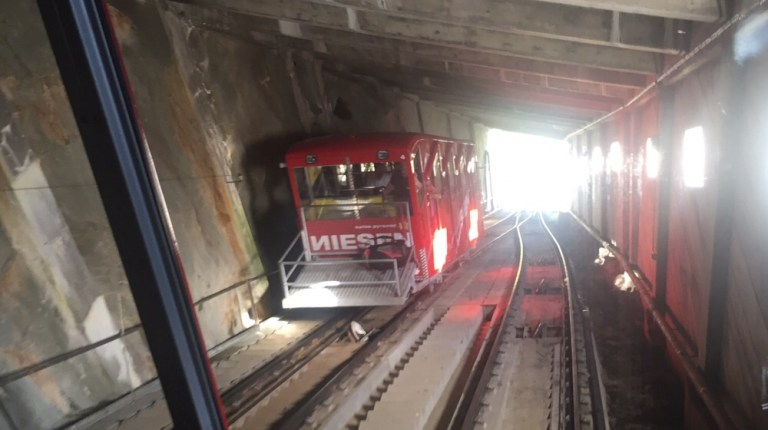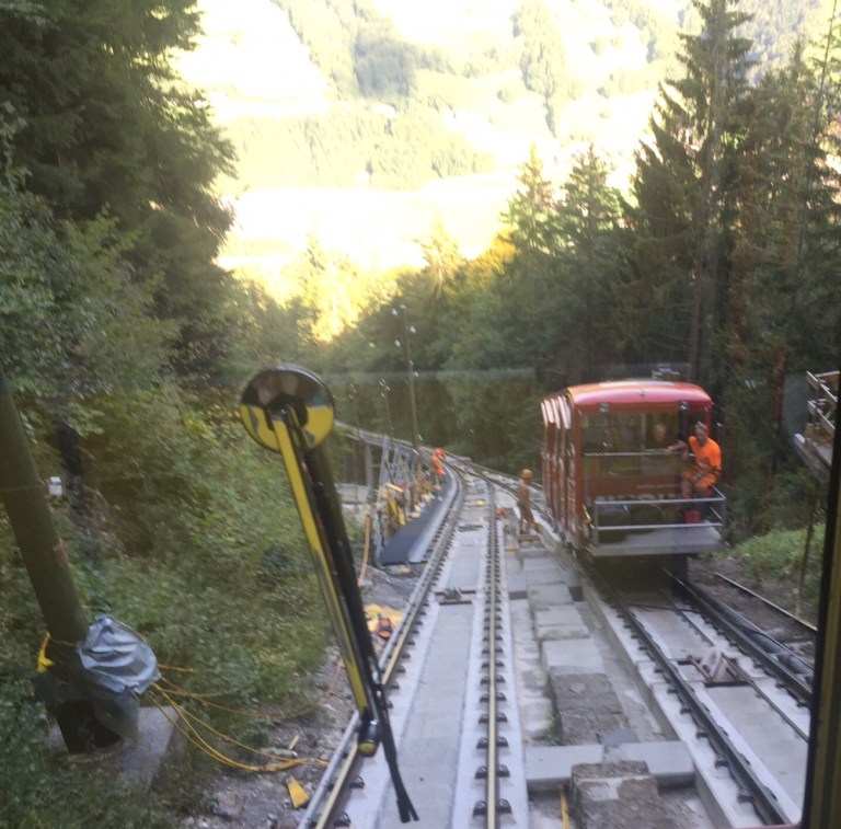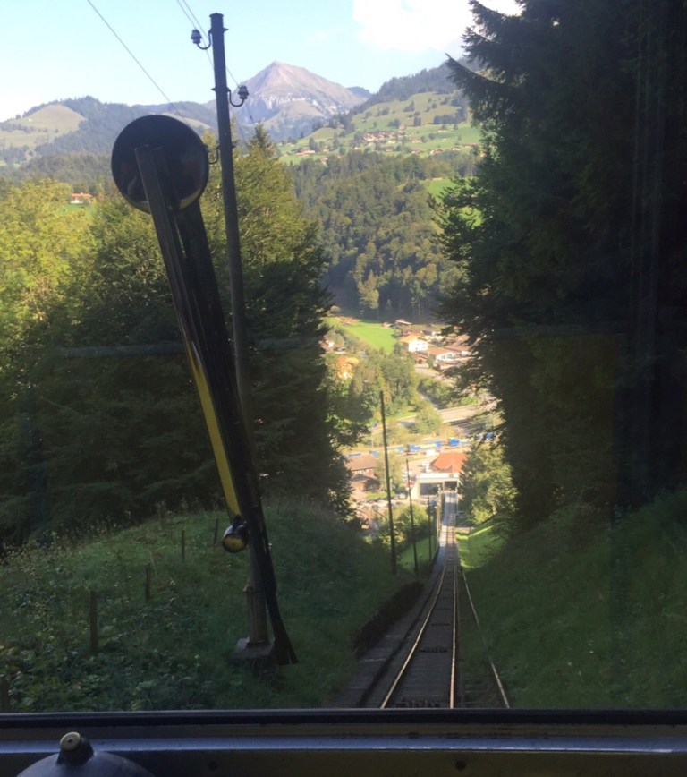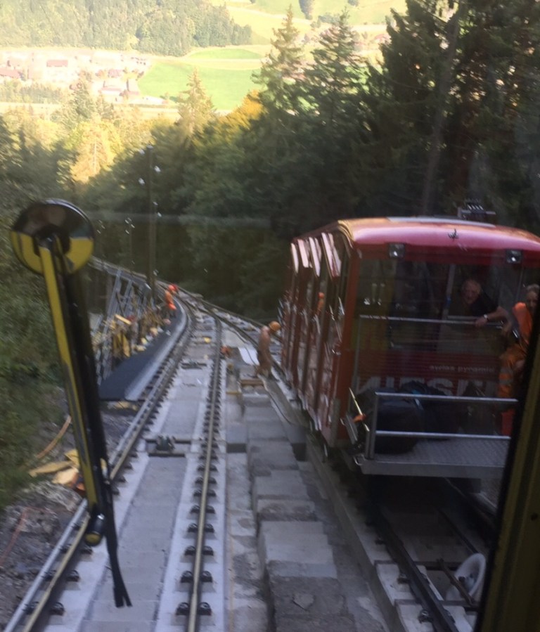 Für die Talfahrt habe ich auf beiden Sektionen einen Spitzenplatz, gleich hinter dem Wagenbegleiter (Lokführer ist, so denke ich, das falsche Wort) gesichert.