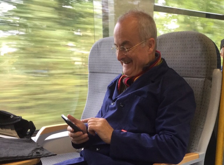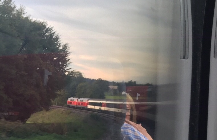 Ich habe einen Sitzplatz in Fahrtrichtung, in einem 4-er Coupé, im Endwagen des ICE erhalten. Mir gegenüber sitzt ein noch fetterer, englisch sprechender Mensch als ich, mit unruhigen langen Beinen, der sich alsbald eine schwarze Augenbinde überzieht und unruhig schläft. Schräg gegenüber ein Deutscher auf Geschäftsreise. Habe eine recht unterhaltsame Diskussion.