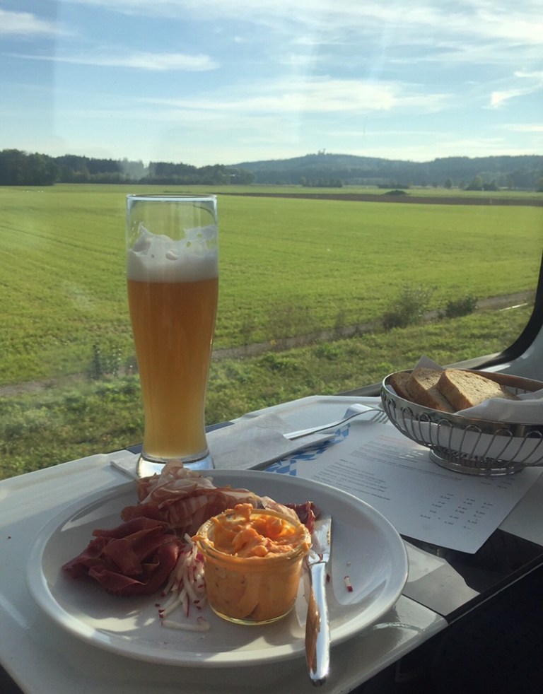 Zudem habe ich schon wieder Hunger. Die Speisewagenbrigade ist, passend zum eben gestarteten Oktoberfest, in Lederhosen und Dirndl gekleidet, ein hübscher, nein ein fescher Anblick!