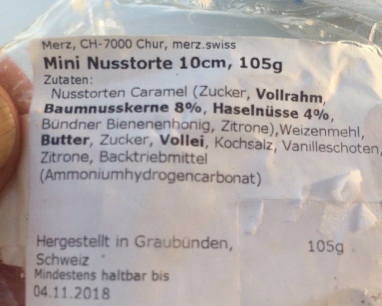 Zum Nachtisch und quasi als Willkommensgruss der nahenden Schweiz, genehmige ich mir zum Kaffee ein Bündner Nusstörtchen. Schade dass dieses so gute Ding so extrem in Plastik eingeschweisst ist, dass ich es nur in Krümmelchen geniessen kann bzw aus dem Plastk herausbeissen muss. Es ist zum Ärgern, diese verführerische Süssigkeit auf die Hosen und den Boden verteilt zu sehen!