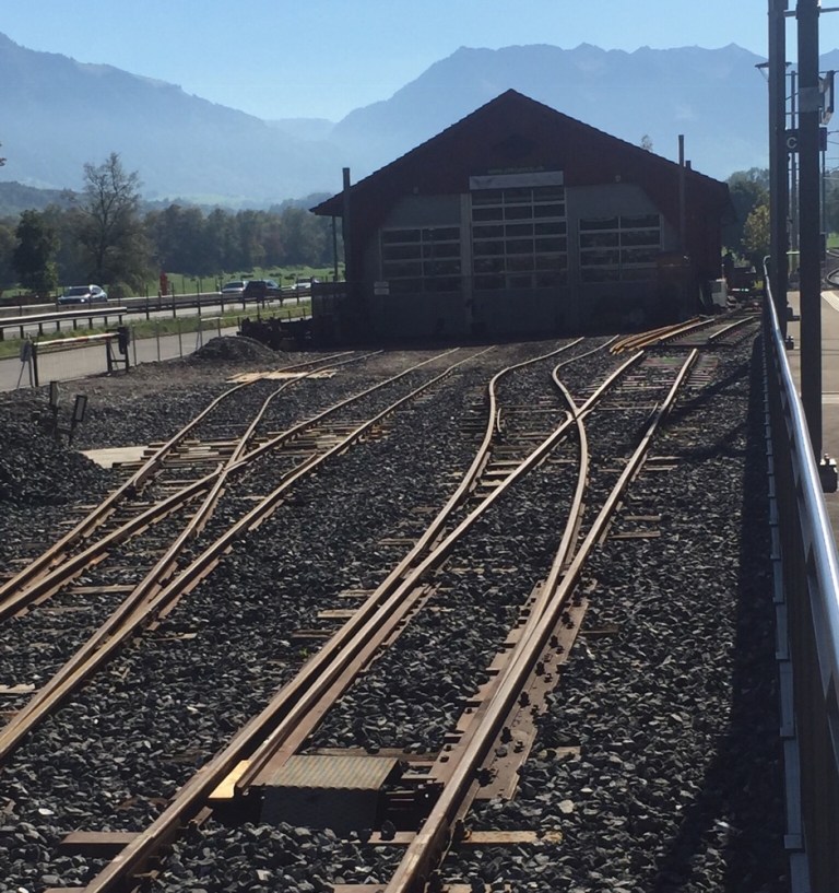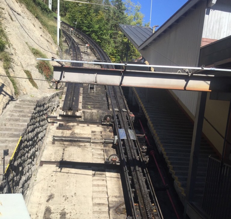 Bei dieser Steigung ist es nicht verwunderlich, dass die 2 Zahnräder waagrecht sich drehen und Schiebebühnen anstelle von Weichen verwendet werden.