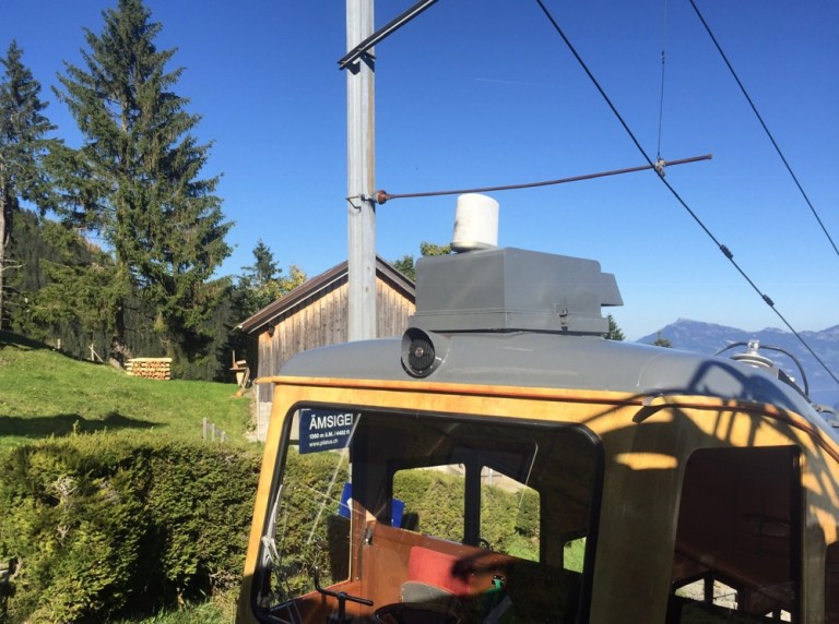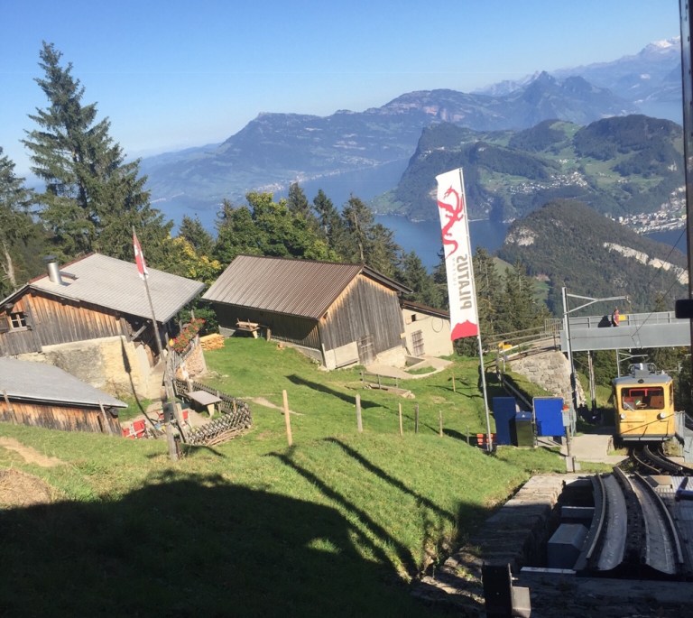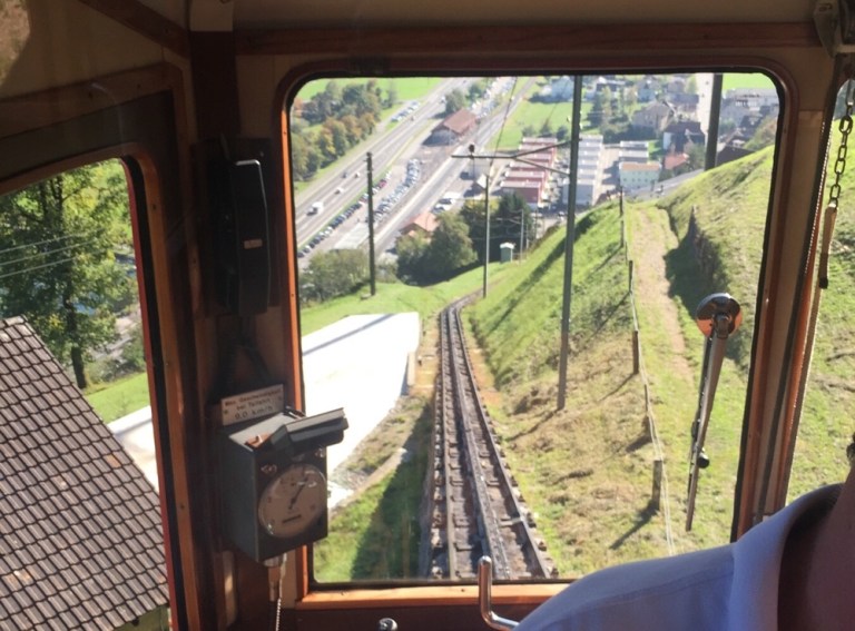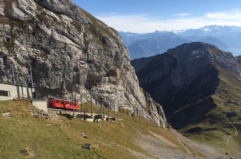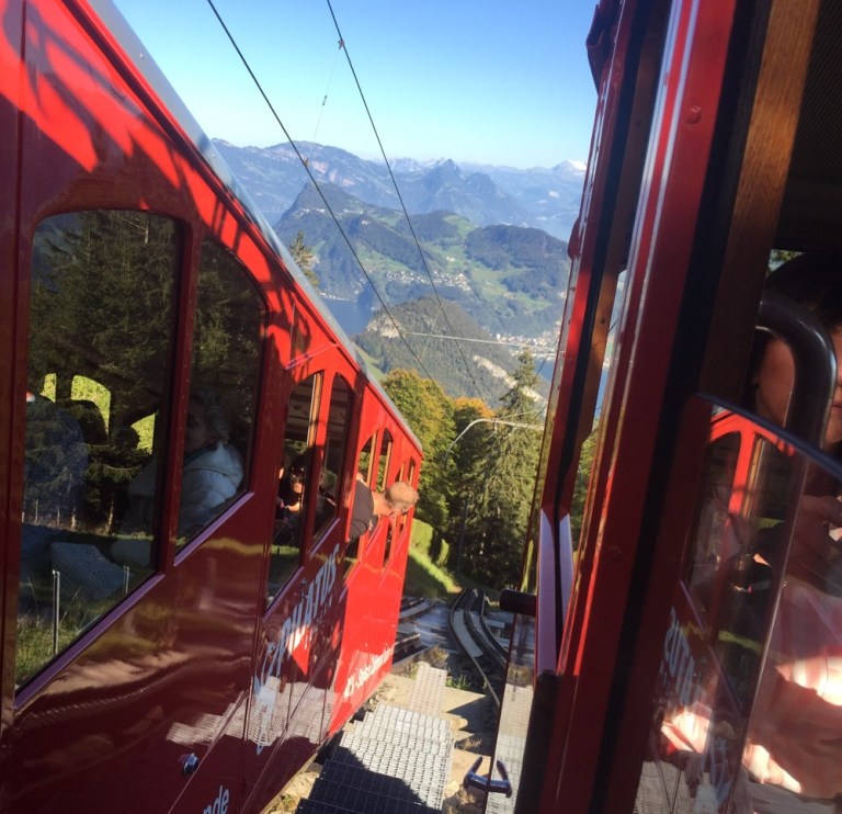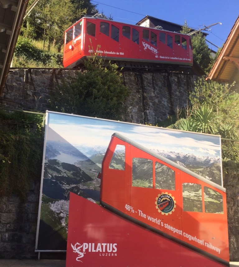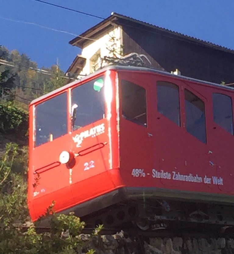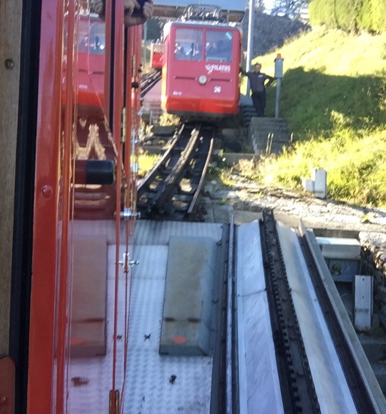 Ich sitze im letzten von 4 bergan fahrenden Einzeltriebwagen. Bis zu schier unglaublichen 480 Promille steil ist die Strecke (https://de.m.wikipedia.org/wiki/Pilatusbahn).