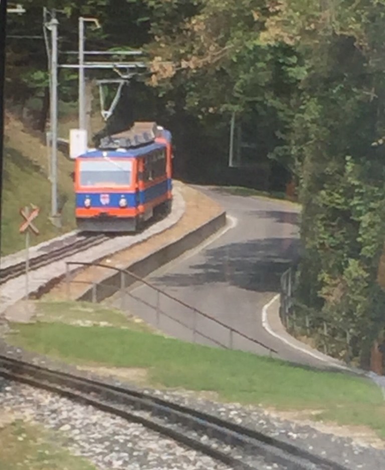 Wir aber steigen nach der Passage des Damms von Melide, bereits in Capolago-Riva San Vitale aus bzw ein letztes Mal um. Hier beginnt nämlich die Fahrt mit der MIGROS Bergbahn auf den Monte Generoso (https://www.montegeneroso.ch/de/monte-generoso/bahn). Zwar ist es recht dunstig und am Himmel türmen sich Wolken, wir hoffen aber auf Wetterglück. Der Zug ist fast bis auf den letzten Platz voll belegt, Herbstferien!