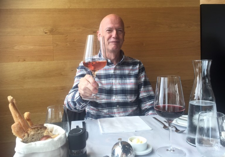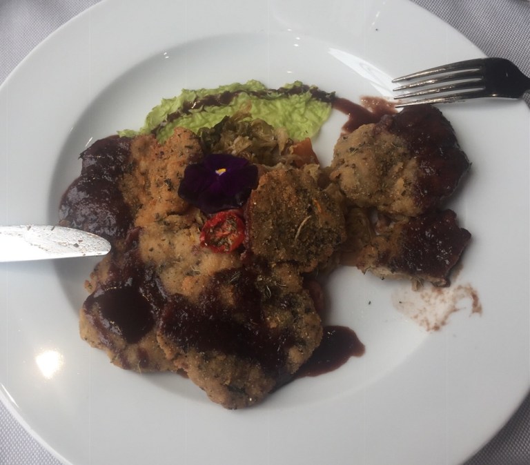 Minestrone bzw Salat, dann panierte Stiertestickel auf Nudeln und Gemüse, dazu ein Glas Rotwein und Wasser, herrlich.