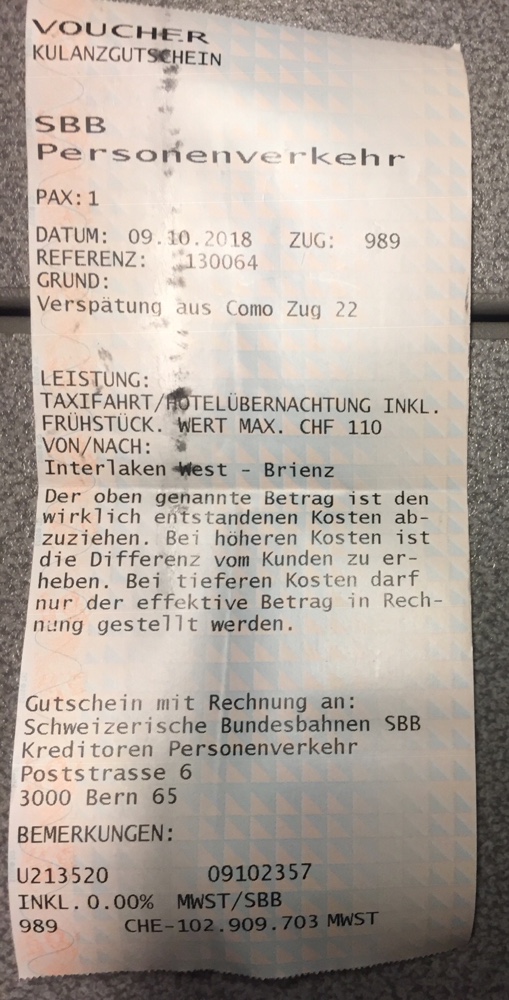 Ich mache mir bereits Gedanken darüber, welches Taxiunternehmen aus Brienz ich bestellen soll. Dem Zugchef ist mein Reisewunsch bereits bekannt, er hat mich erwartet. Seine Kollegin übergibt mir einen Gutschein mit den notwendigen Angaben inklusive Zugnummer und Grund für meine Reiseplanänderungen.