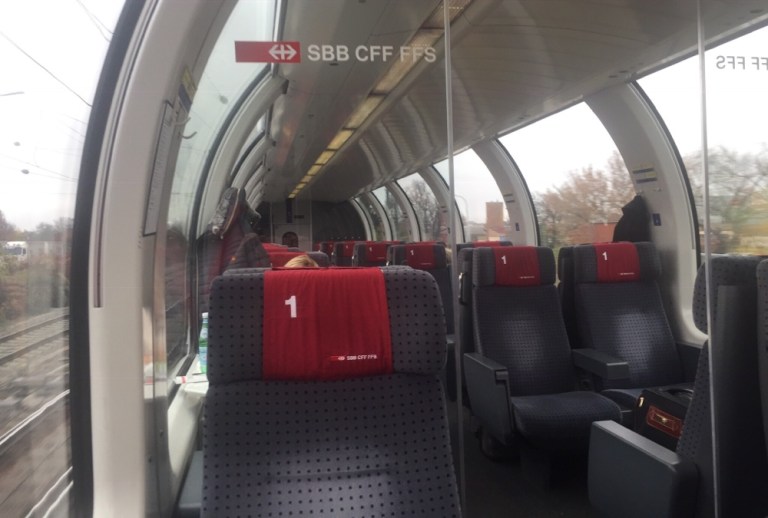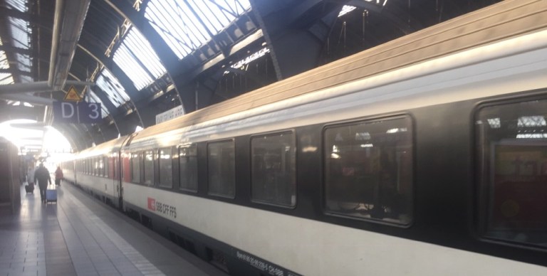 Umsteigen in Basel SBB auf einen Intercity-Zug nach Hamburg. Er besteht komplett aus sehr dreckigen SBB Wagen. Ich finde einen Platz im Panoramawagen, den ich mir elektronisch nicht buchen konnte.