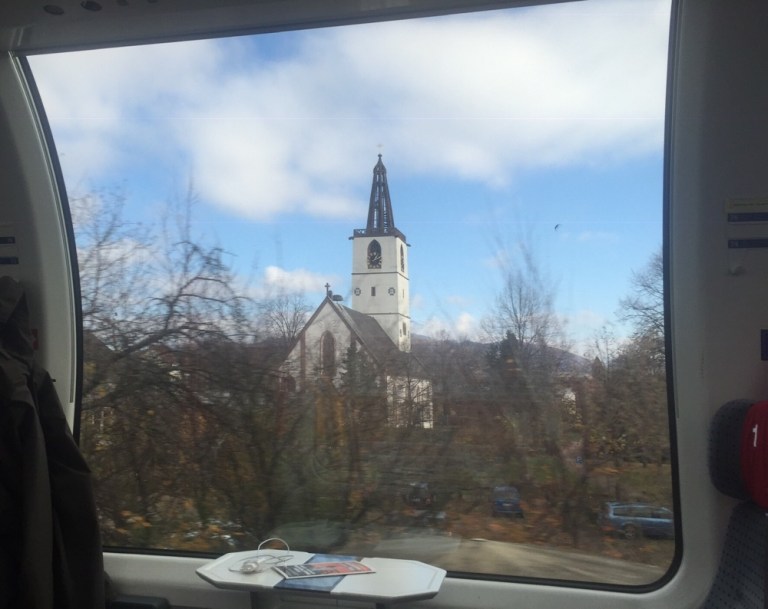 Kurz nach 9 Uhr laufe ich zum Bahnhof, noch ist Nebel auch in Brienz, aber die Sonne drückt. Hinter dem Giessbachtunnel ist der Nebel dann aber undurchdringbar dicht; dies bleibt so bis nach Verlassen der Schweiz.