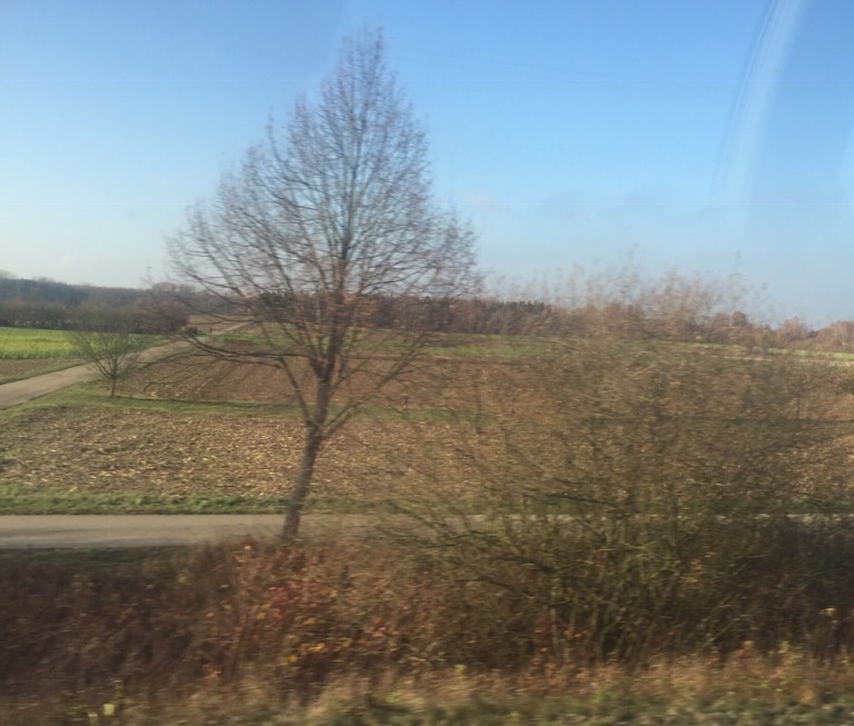 In der Gegend um Bad Krozingen ist plötzlich blauer Himmel. Farblich schöne Herbstlanschaft in gleissender Sonne. Jetzt macht die Fahrt im SBB Panoramawagen Richtung Hamburg, erst richtig Spass.