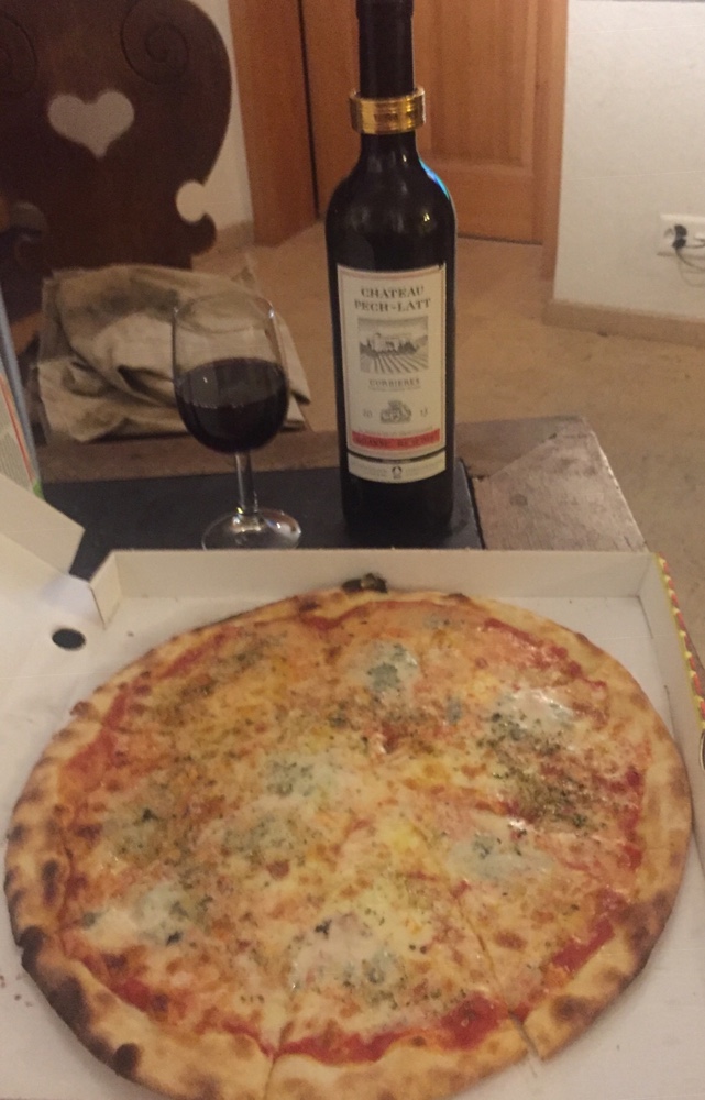 Ich habe jetzt Hunger, der Kühlschrank ist leer. Glücklicherweise ist Bino’s Pizzeria vis-à-via offen. Bestelle mir eine Pizza Gorgonzola, die ich daheim zusammen mit einem Glas Wein vor dem TV, während dem Kassensturz, geniesse.