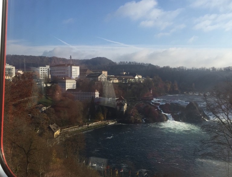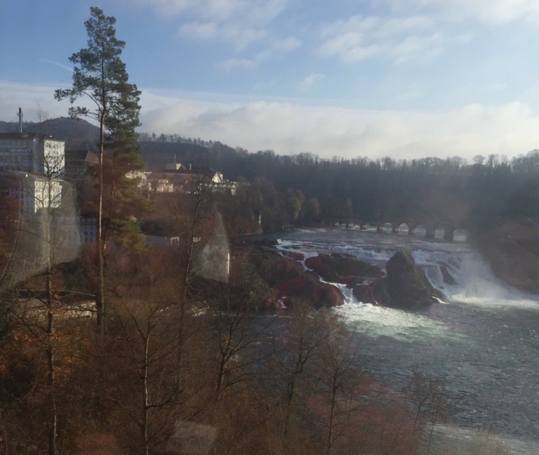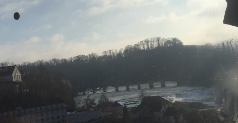 auf den Rheinfall, das Schloss Laufen am Rheinfall und die gemauerte Eisenbahnbrücke oberhalb des Rheinfalls. Der Rhein führt immer noch sehr wenig Wasser! Schade, dass wir hier nicht anhalten können.
