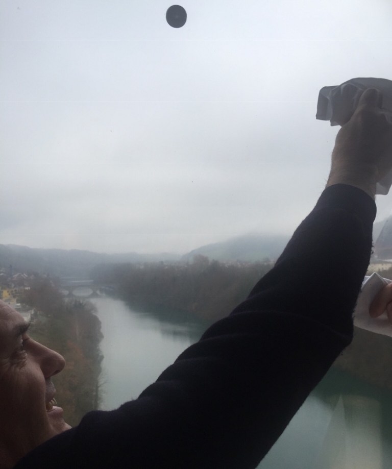 Im Niemandsland zwischen der Schweiz und Deutschland tauchen wir wieder ein in den dichten grauen Nebel. Wieder beschlagen sich die Fensterscheiben und werden von unermüdlichen Mitfahrenden klar geputzt, Danke!