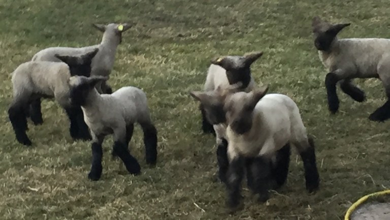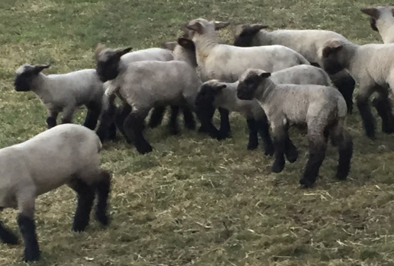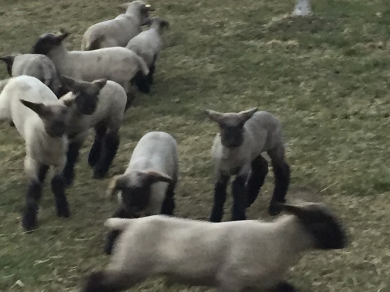 daheim in meinem Heimetli sehe ich viele umherspringende Kreaturen. Über ein Dutzend junge Lämmer hüpfen freudig über die Weide.