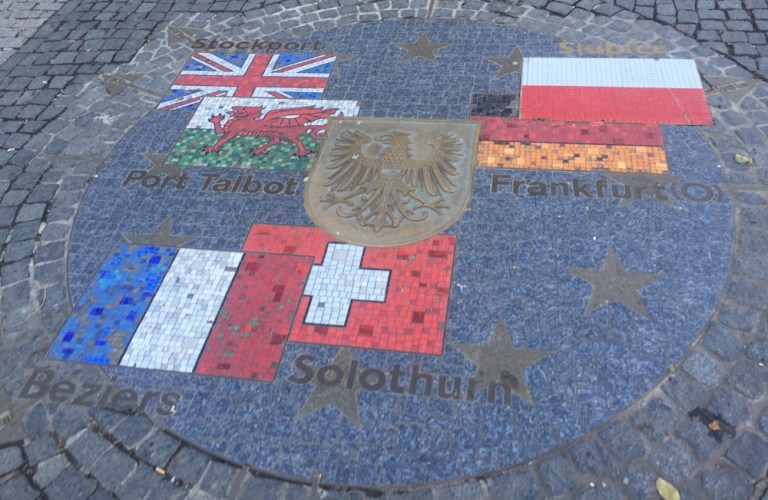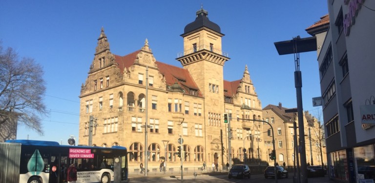 Friedrich-Ebert-Brücke, Rathaus mit Vorplatz (die Partnerstadt Solothurn soll nur 249 Luftlinienkilometer entfernt sein)