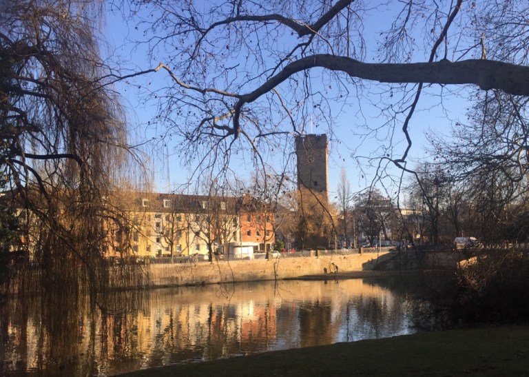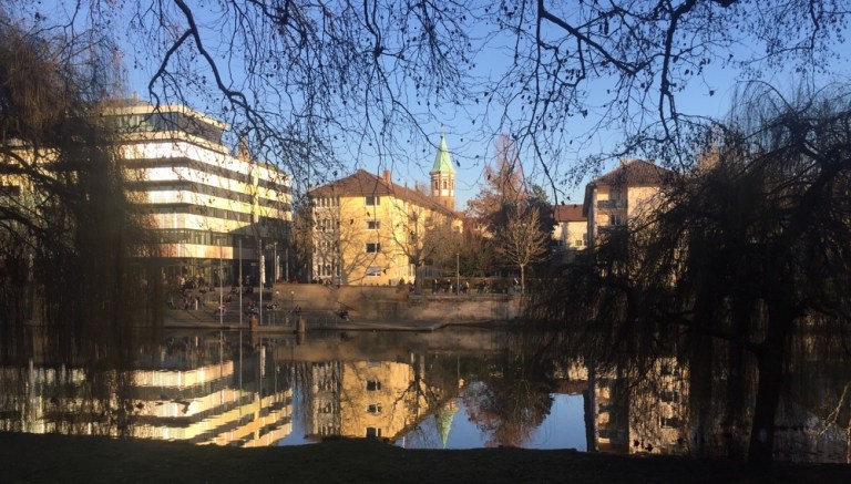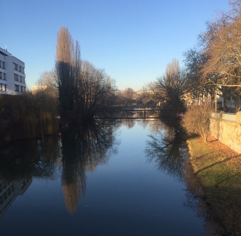 Kurz Ausruhen, nach 16 Uhr zu Fuss Richtung Stadtzentrum: Neckar, Theaterschiff,