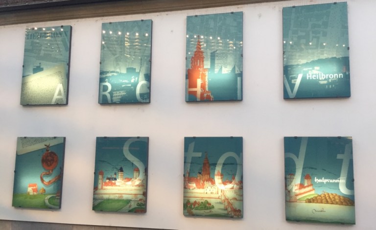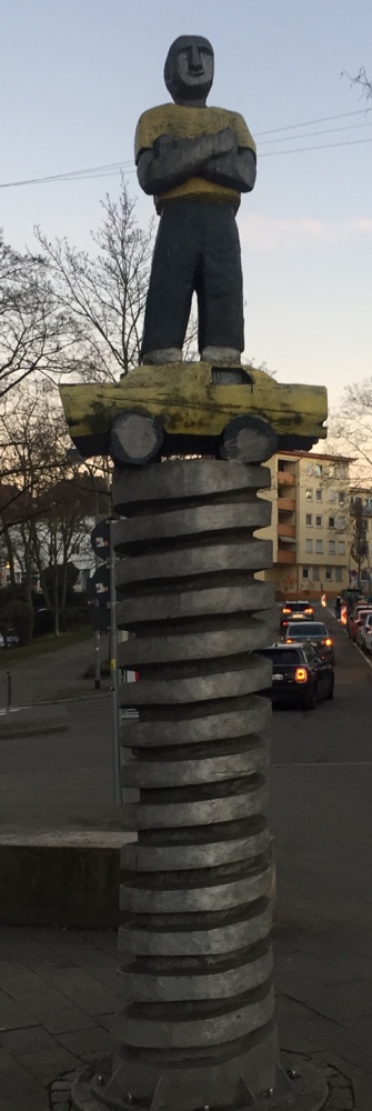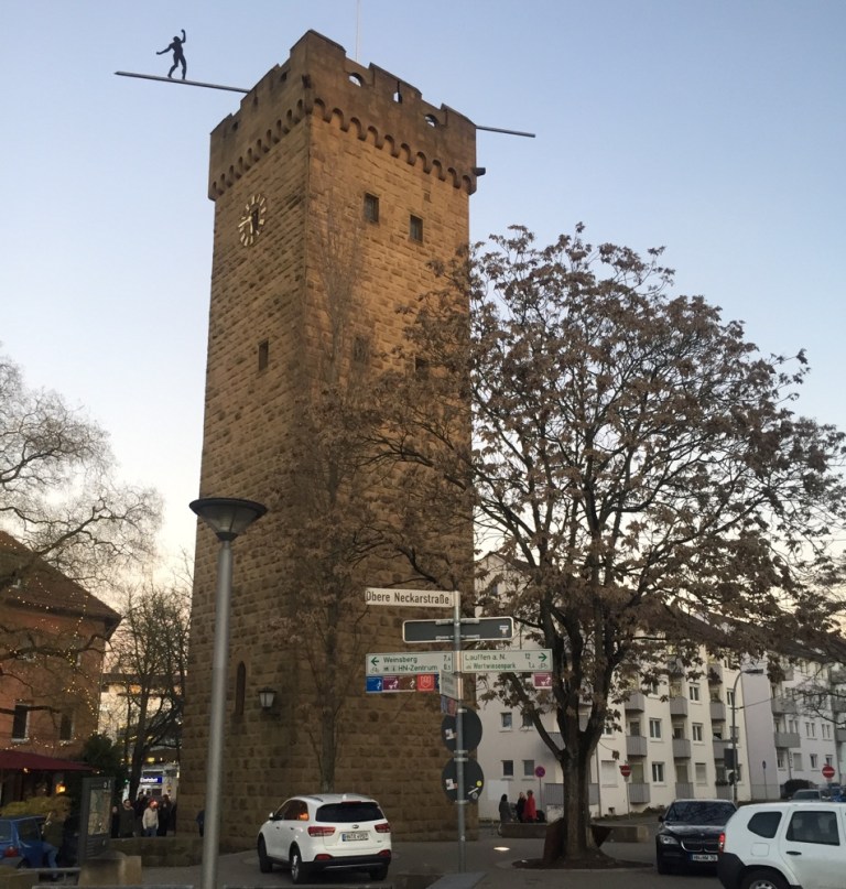 Hafenmarktturm, kreuz und quer durch die Stadt, am Denk-mal der Autostadt Heilbronn vorbei