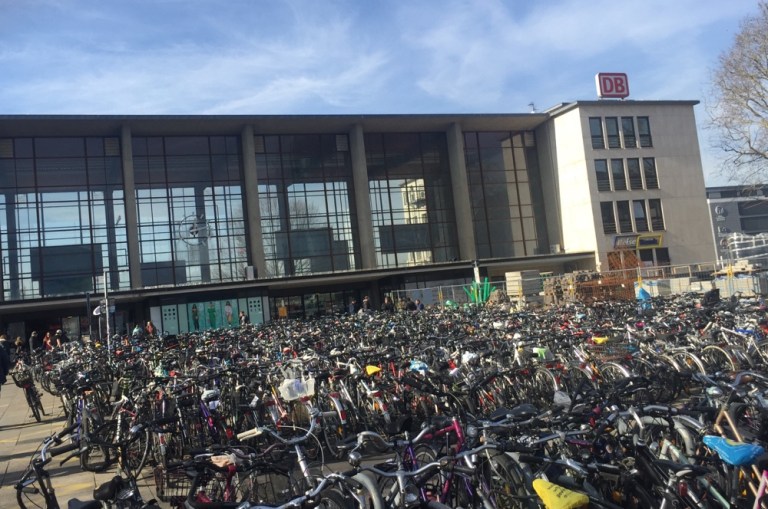 Bahnhofplatz, telefoniere, geniesse die wärmende Frühlingssonne. Relativ viele, meistens jüngere Leute tragen schon Shorts und T-Shirt.