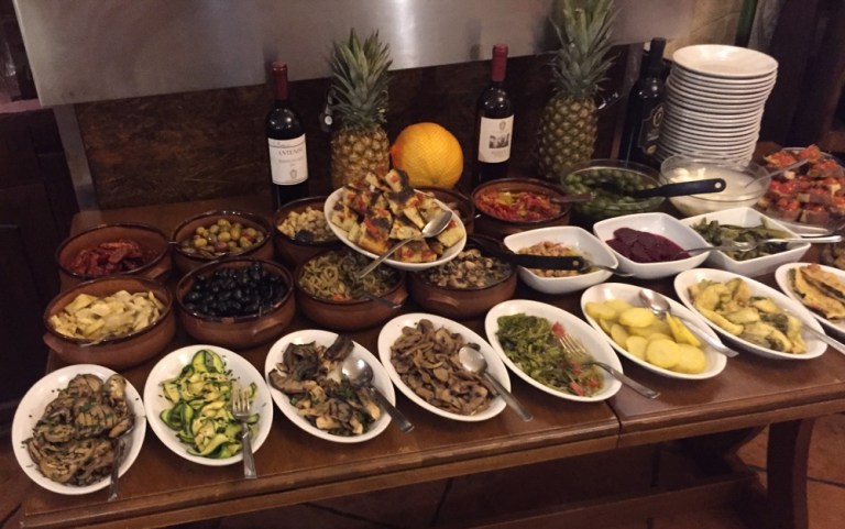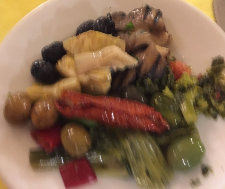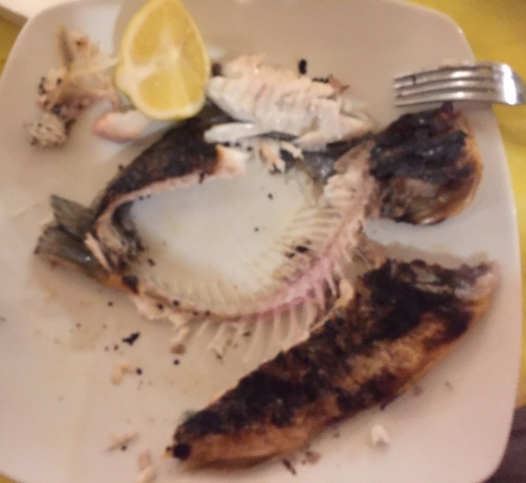 Oliven, Wasser, leckeres Vorspeisenbuffet, ein Glas Weisswein, gemischter Salat, einen frischen, gegrillten Fisch aus dem Mittelmeer, etwas Hartkäse, frischen Fruchtsalat, Kaffee. Alles zusammen für 25 Euro, das ist unübertroffen günstig!