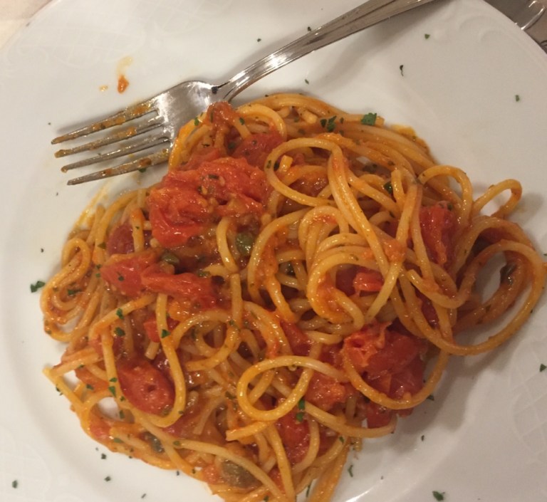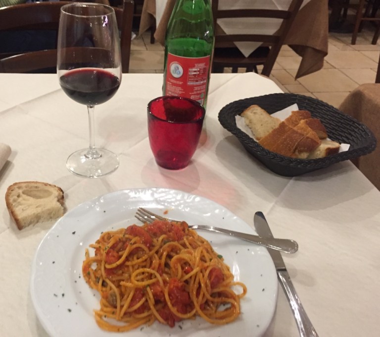 Spaziere ein paar Blocks bis zur Pizzeria „da Gianni“. Zum Glück hat es noch ein Tischchen für mich. 1 Liter Sprudelwasser und 1 kleines Glas trockener Rotwein, Brot,