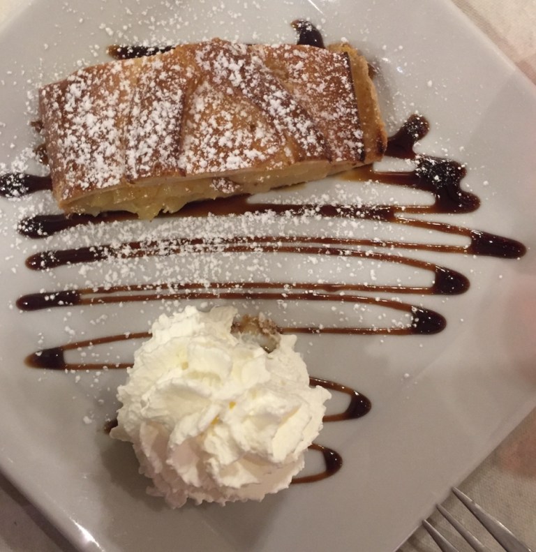 Apfelstrudel mit Schlagrahm. Bin satt, habe mich aber nicht überessen!