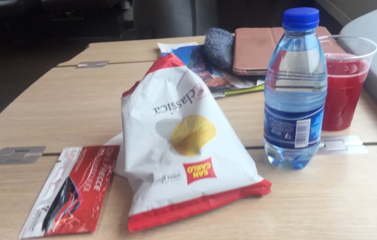 Es reisen ab Milano heute in diesem Wagen nur knapp 10 Leute mit. Henusode, so kann ich wenigstens in Fahrrichtung sitzen. Schon bald werden von einem Steward mit weissen Handschuhen die neuesten Tageszeitungen verteilt und anschliessend Chips, Blutorangensaft und Wasser kredenzt.