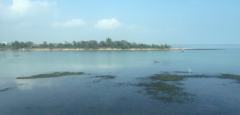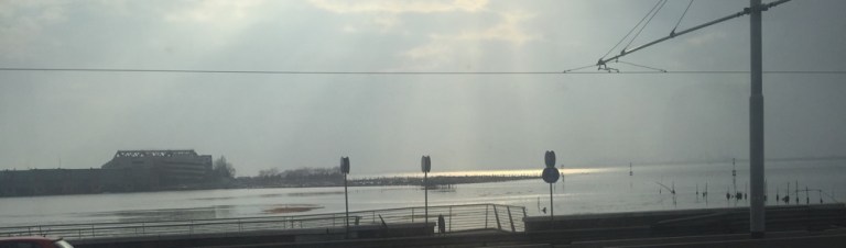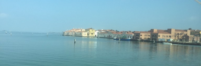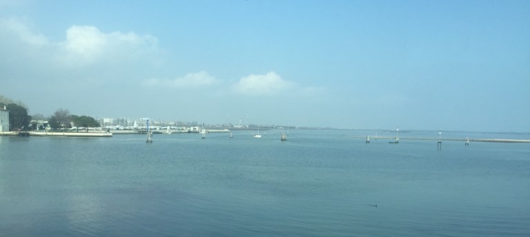 Während der Fahrt über Damm und Brücke von VE Mestre nach Venezia Santa Lucia ist sogar die Sonne zu sehen.