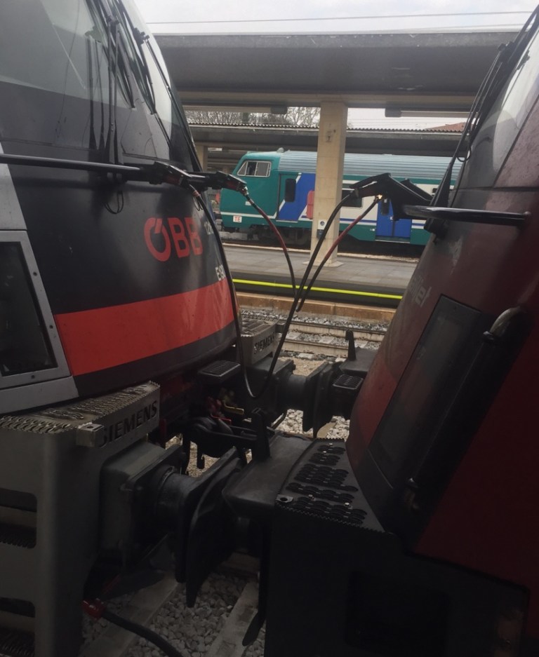 Kaum haben wir die Schweiz verlassen, stehen wir in Italien, im Bahnhof Varzo, auf dem Abstellgleis, Gleisbauarbeiten, Einspurbetrieb – wir müssen die Vorbeifahrt eines anderen