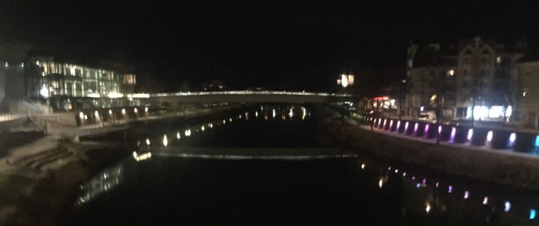 19.11 in Villach. Hier schliesse ich den heutigen Reisetag ab. Nach Hotelbezug am Bahnhofplatz und kurzem Relaxen, spaziere ich durch die Innenstadt bis an das Flussufer der Drau.