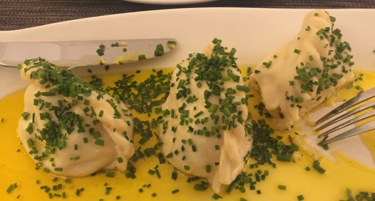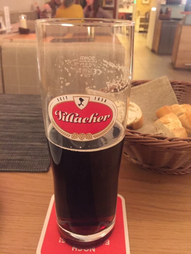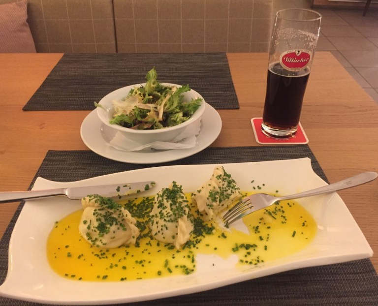 Im goldenen Lamm trinke ich ein dunkles Villacher, esse ein Salätchen und Kärntner Käsnudeln und geniessse zum Abschluss mit Waldbeeren gratinierte Mascarponecreme.