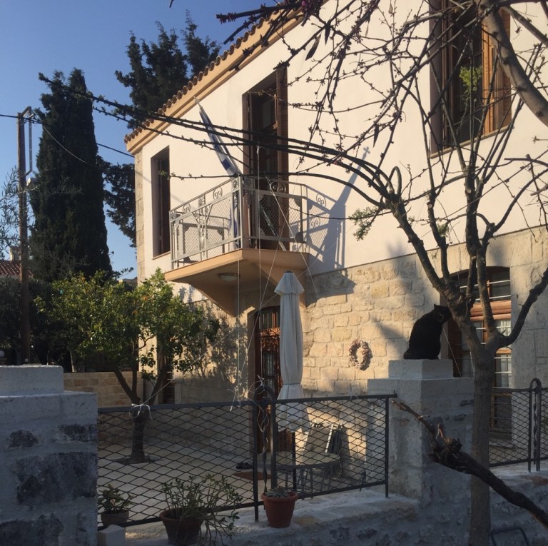 Michali montiert vor dem morgigen Unabhängigkeitstag, auf dem Balkon, noch rasch die griechische Fahne. Dann trinken wir Frappe, kalten, aufgeschäumten Neskaffee, diskutieren und lachen.