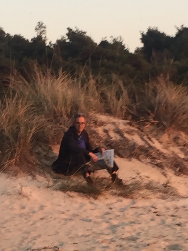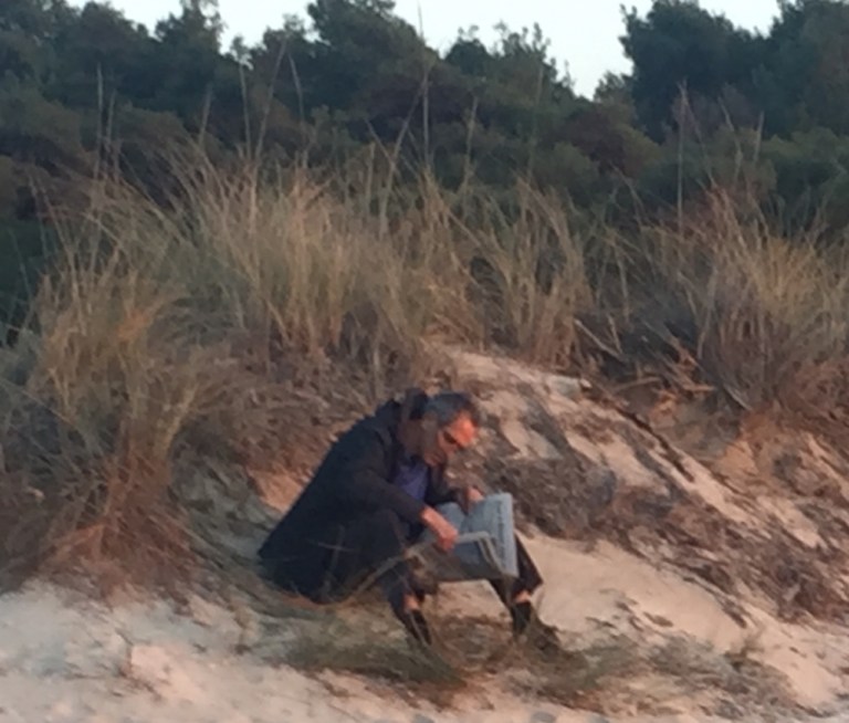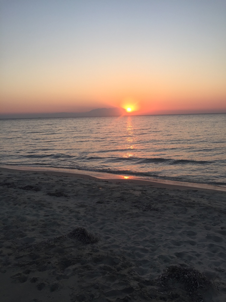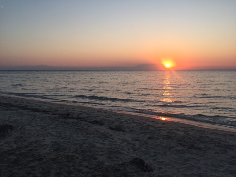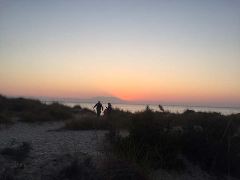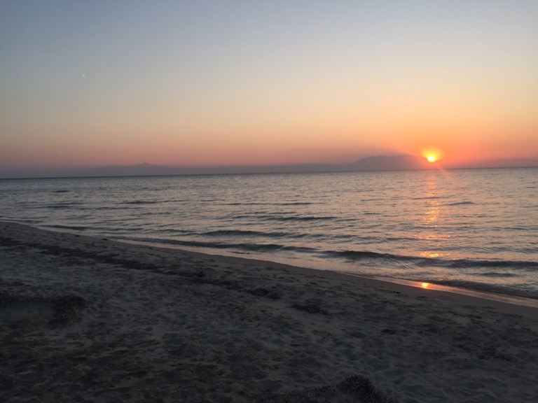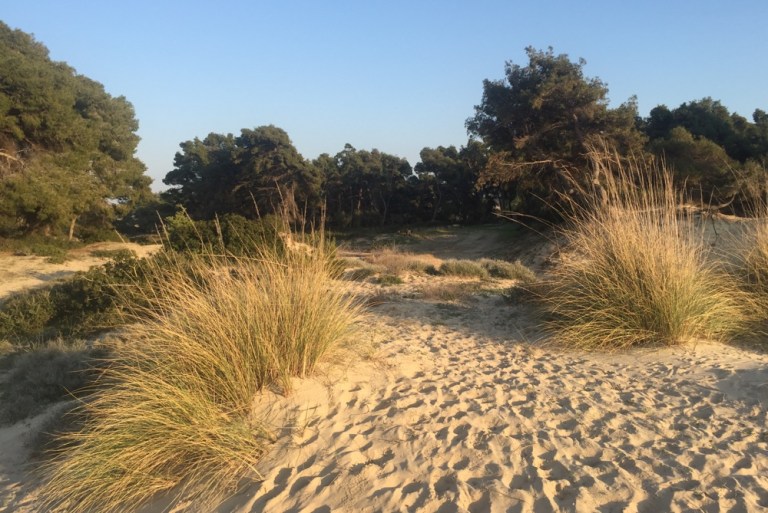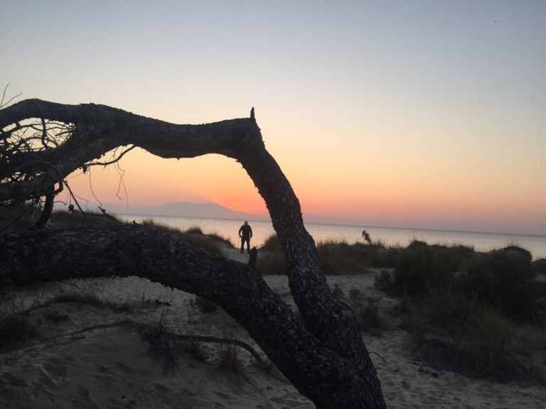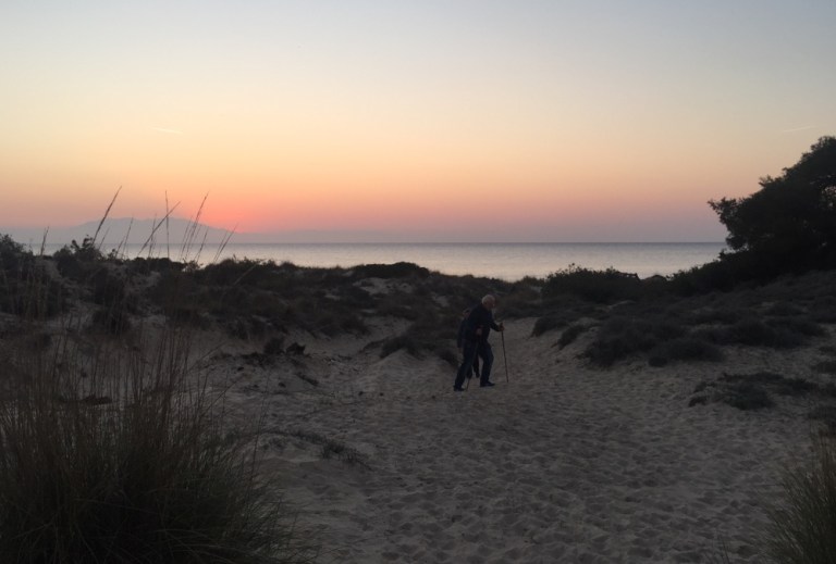 Nachdem die Sonne knapp nördlich des gut sichtbaren Olymps niedergegangen ist, spazieren wir durch die Dünen und den offenen Wald zurück zum Auto.