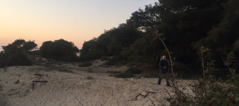 Nachdem die Sonne knapp nördlich des gut sichtbaren Olymps niedergegangen ist, spazieren wir durch die Dünen und den offenen Wald zurück zum Auto.