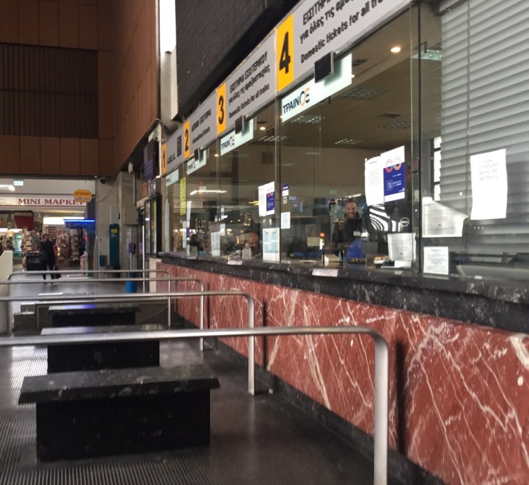 Während alle Griechen am Bahnschalter für internationale Verbindungen (es gibt momentan bzw seit vergangenem Sommer gar keine) anstehen und von einem männlichen Wesen kompetent bedient werden, gehen wir an einen der drei Schalter für Inlandzüge. Die junge Dame da kennt offenbar nur den Befehlston.