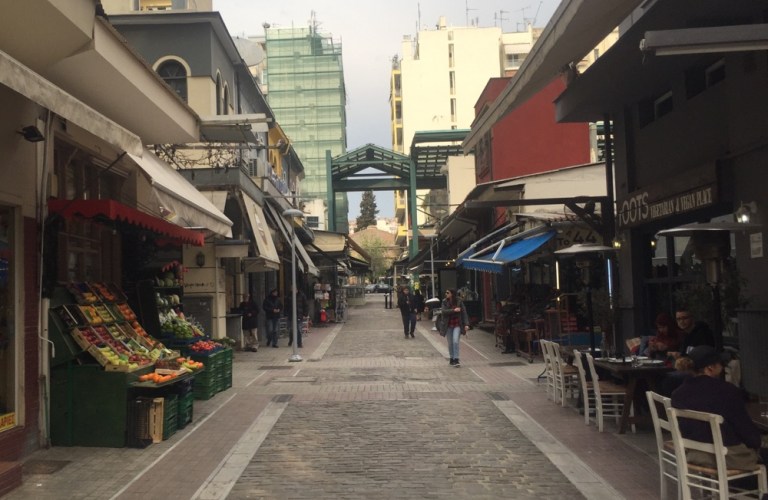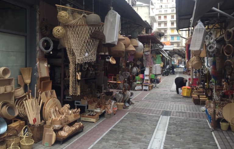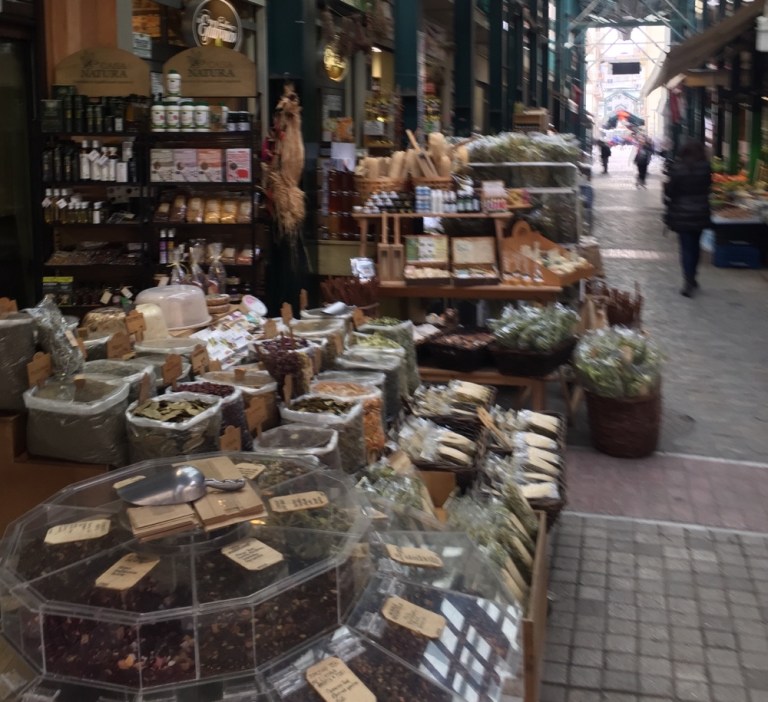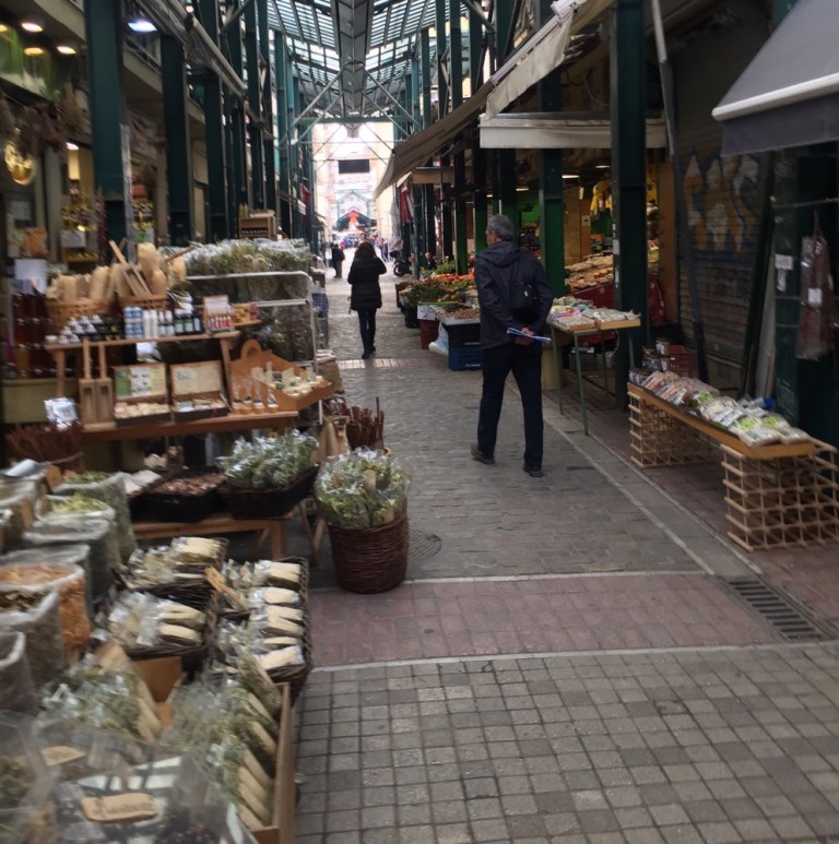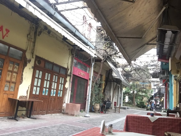 Wir gehen ins ehemalige Handwerkerquarrier Athonas in eine Ouzeri etwas Kleines bzw Vorspeise essen. Drinnen ist es voll und ’sie paffen wie die Besenbinder‘. Für schweizerische Verhältnisse ist es angenehm, wie auch die Preise. Raki + Meze für 2 = 8 Euro (für 2). Kaum sind wir fertig, erscheint gegen halb 5 (16.30) auch schon Michali, zusammen mit einem OTE Kollegen, den ich noch von Afitos her kenne, der sich aber leider bald verabschiedet.