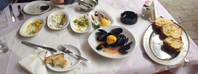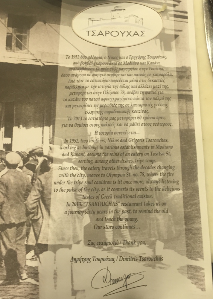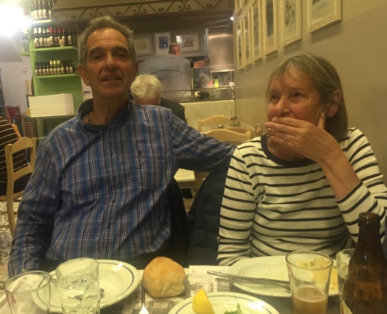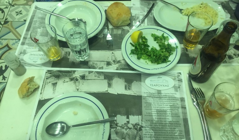 Michali führt uns zu einem nicht weit entfernten Restaurant, dessen Spezialität Kutteln aller Art sind. Wunderbar, dazu ein griechisches Weizenbier. Hinterher gibt es ein Flan Carmela und dann noch Schnitten.