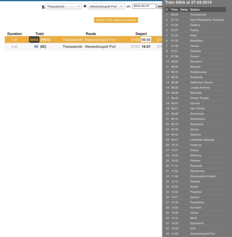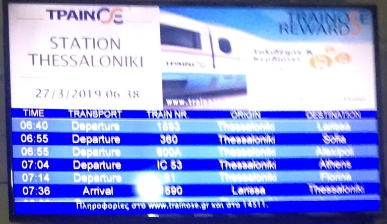 6.35 wird am Lautsprecher bekannt gegeben, der Zug nach Alexandroupolis sei zum Einsteigen bereit. Wir lassen uns nicht lange bitten. An der elektronischen Abfahrtsanzeige stehen 2 Züge, einer davon (600A) fährt nach Alexandroupoli, der andere (360) nach Sofia.