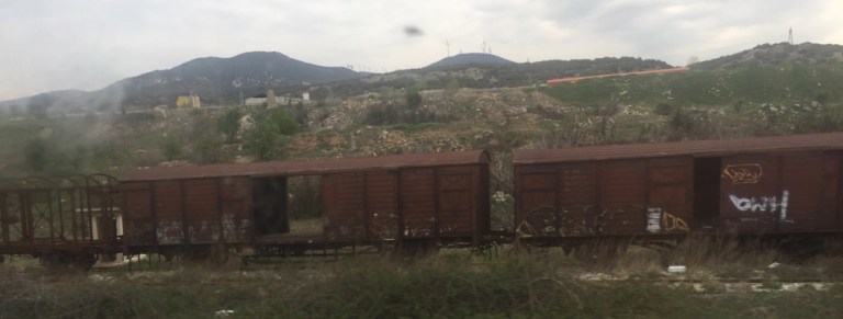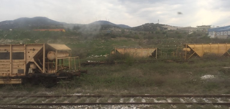 Östlich von Drama wird die Landschaft dramatisch! Karstlandschaft, tiefe Schluchten, unzugängliches Gebiet. Mehrere Schluchten durchfahren wir. Die Bahn folgt dem Fluss, fährt hin und wieder durch Galerien und Tunnel.