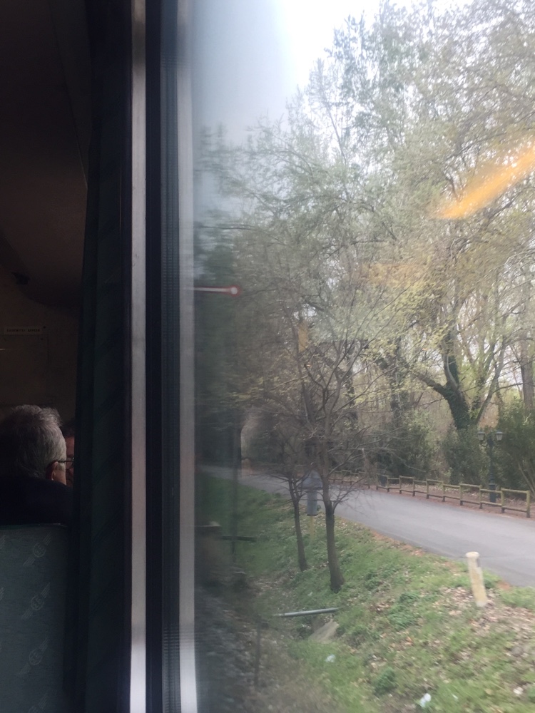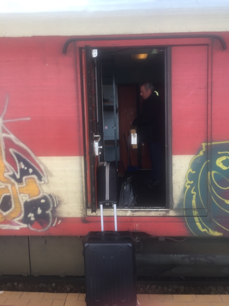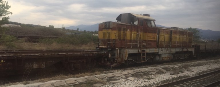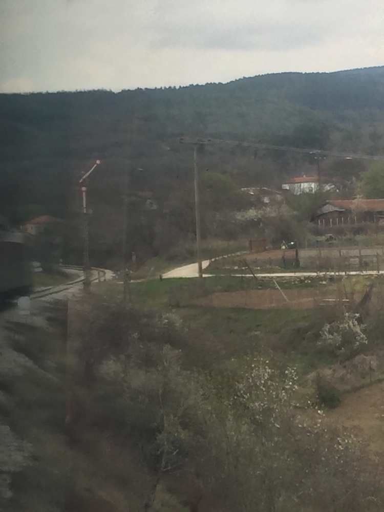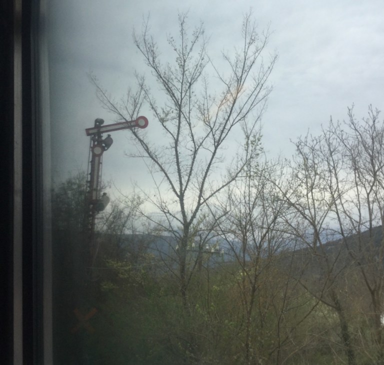 Pünktlich auf die Sekunde rollen wir los. Über die Weichen in der Bahnhofsausfahrt rollt der Zug in etwas höherem Schritttempo, es kracht schrecklich, Metall an Metall, die Angst einer Entgleisung ist da, jeder lauscht. Kaum aus dem Bahnhof ist der ganze Gleiskörper neu, die Schienen verschweisst, der Reisekomfort gross. Die ganze Zugskomposition ist versprayt und die Fenster ausser die der Führerstände sind total schmutzig (besseres Milchglas). In den Abteilen der 2. Klasse, in den Triebwagen sind Lärm und Erschütterungen zudem gross! Die 30-jährigem Züge halten sich aber recht wacker. Wir halten nur dort wo Reisende auszusteigen bzw einzusteigen wünschen. leider sind die fenstergriffe weg und die Übersetzfenster 3-4-fach verschlüsselt. Es bleibt also nur die Möglichkeit durchs Glas zu fotografieren.