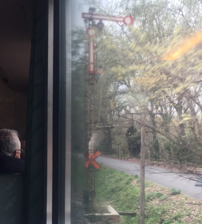 Anfangs bin ich bei der Vorbeifahrt an geschlossenen Flügelsignalen mit unveränderter Streckengeschwindigkeitrecht beunruhigt. Dann aber sehe ich dass viele Signaldrähte gekappt worden sind und ich merke dass die meisten Signale Halt zeigen und teilweise mit orangen Kreuzen ungültig gemacht wurden. Ein Teil der Signale befindet sich auch in halber Stellung und mindestens einmal sehe ich ein offenes Vorsignal mit dazugehörendem rotem Hauptsignal.