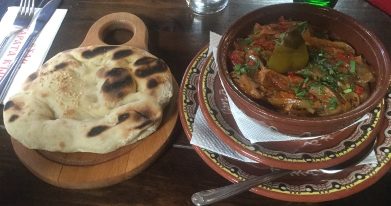 Typisch bulgarische Schweinefleischsuppe mit Tomaten, Zwiebeln und Knoblauch. Dazu esse ich ein Fladenbrot.