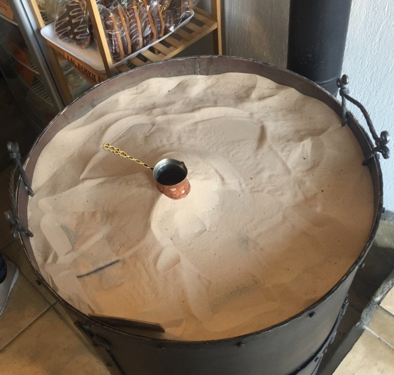Tolle Idee, kaffeepfännchen im heissen Sand auf dem Ofen, insbesondere auch wenn mehrere Kaffee gleichzeitig bestellt wurden.