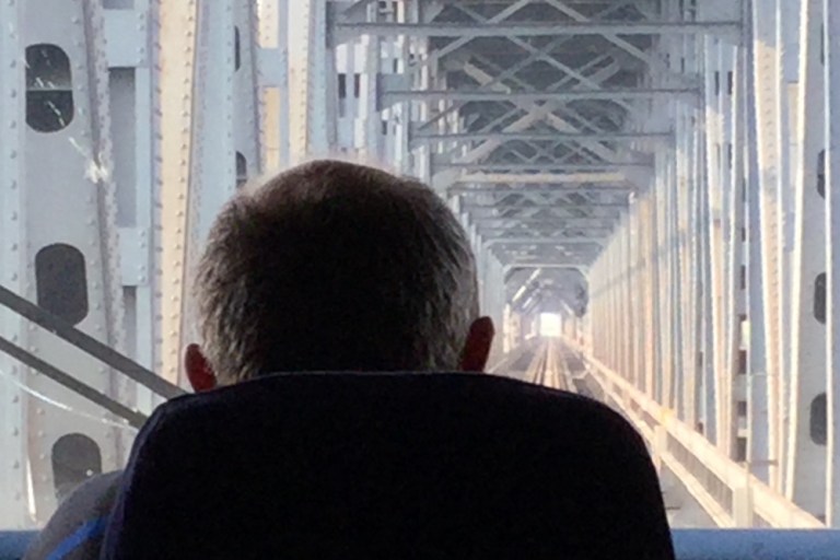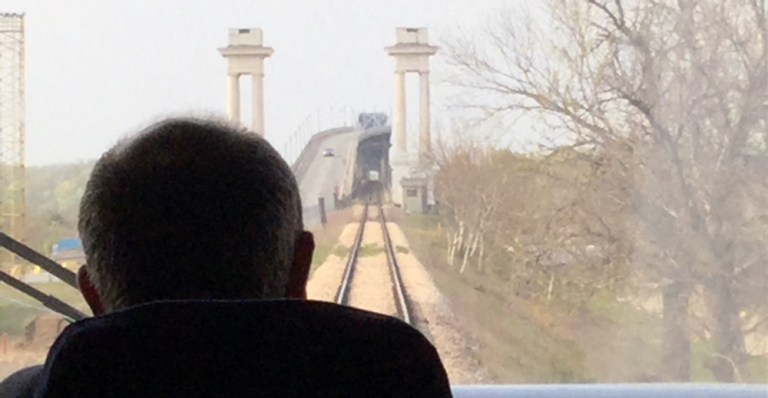 Gemütliche Reise über die doppelstöckige Eisenbahn-Strassenbrücke über die Donau.