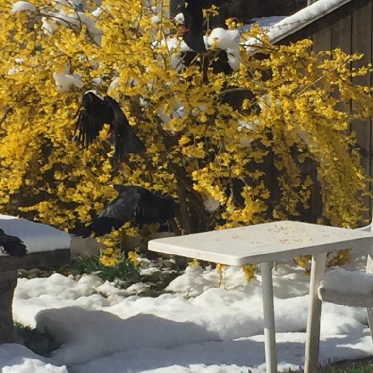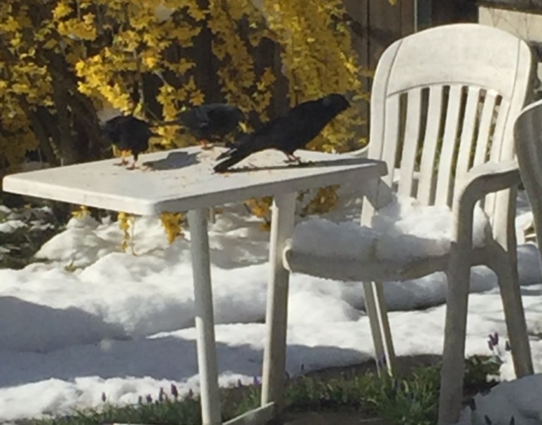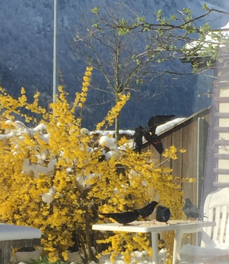 Trotzdem fliegen Tächen oder sind’s Dohlen ein. Auf dem Haus vis-à-vis, sitzen sie auf den Firsten und Kanten, warten auf Fütterer. Ich habe noch Vogelfutterfett und ungesalzene kleine Erdnüsse, die ich auf dem schnell geräumten Gartentisch ausbreite. Die schwarzen Gesellen mit den gelben Schnäbeln kommunizieren eifrig untereinander, sind den Menschen gegenüber aber sehr scheu. Sie nähern sich nicht, also gehe ich ins Haus.
