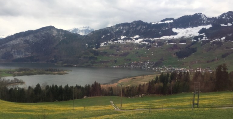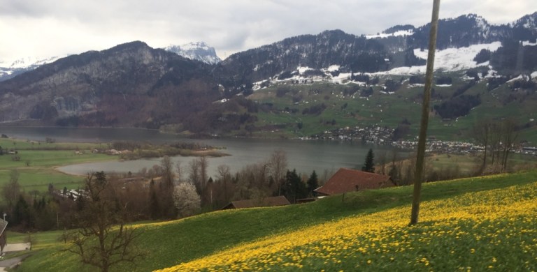 Lauerzersee umgeben von Söiblueme, resp. blühendem Löwenzahn