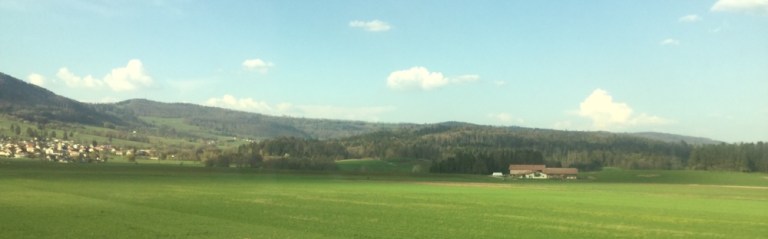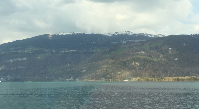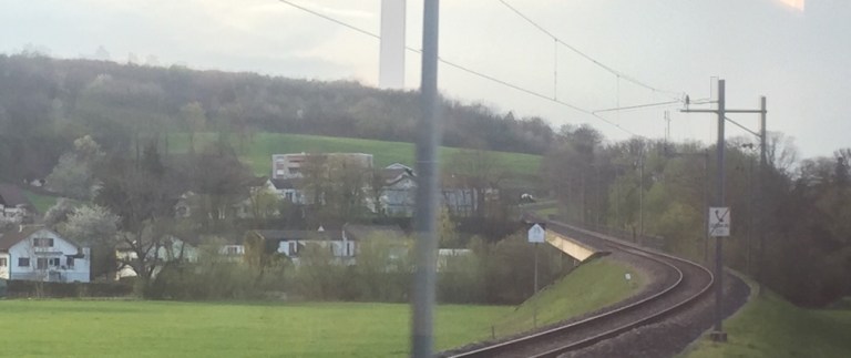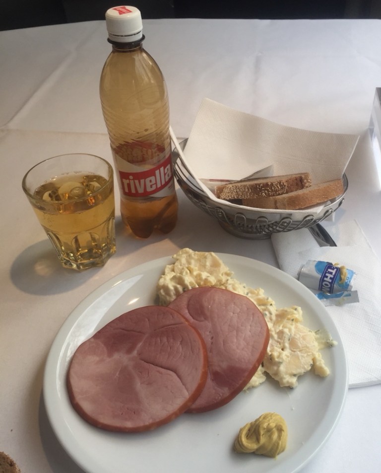 Umsteigen in Interlakens Ostbahnhof auf einen Intercity. Habe Hunger, geniesse im Speisewagen warmen Schinken mit Kartoffelsalat und Rivella.