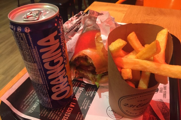 Die günstigen Gaststätten sind alle über belegt, in eine teure Beiz mag ich nicht. Esse in einem Hamburgerrestaurant.
