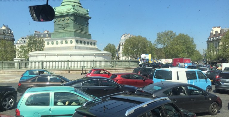 Osterstau allenthalben. Sehr weit vorne, an der Bastille scheint etwas zu brennen. Blaulicht und Sirenen überall. Erste Polizisten und Verkehrslenker berichten von randalierenden ‘gilets jaunes‘. Busfahrer und jüngere Fahrgäste müssen bald einmal mottende Absperrungen und rauchende Autoreifen beiseite räumen, da wir nicht wie die Autofahrer über den Radweg ausweichen können. Noch einmal können wir 250 Meter fahren, dann aber ist Schluss. Es geht weder vorwärts (200 Meter vor uns brennt es lichterloh), noch rückwärts.