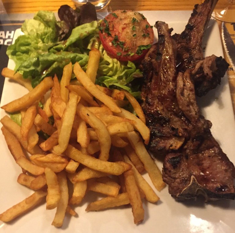Lammkoteletten mit Pommes, dazu Merlot und Wasser.