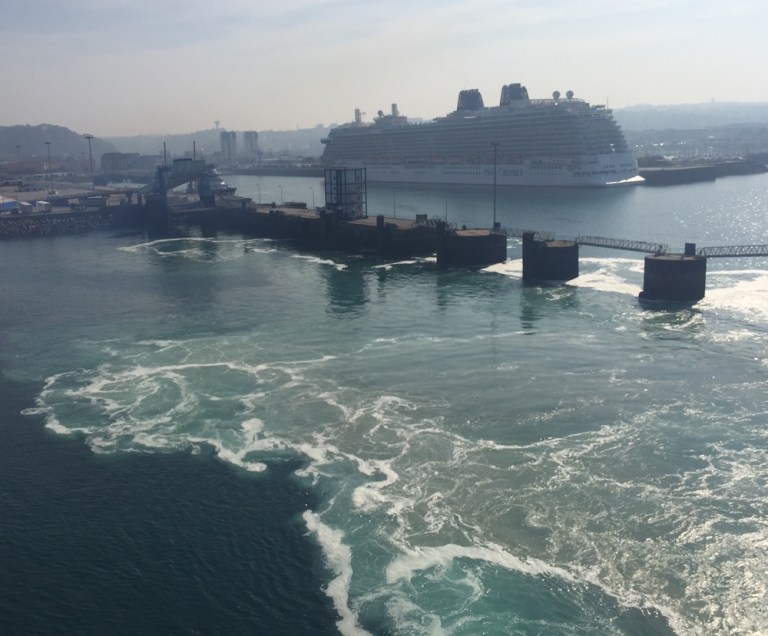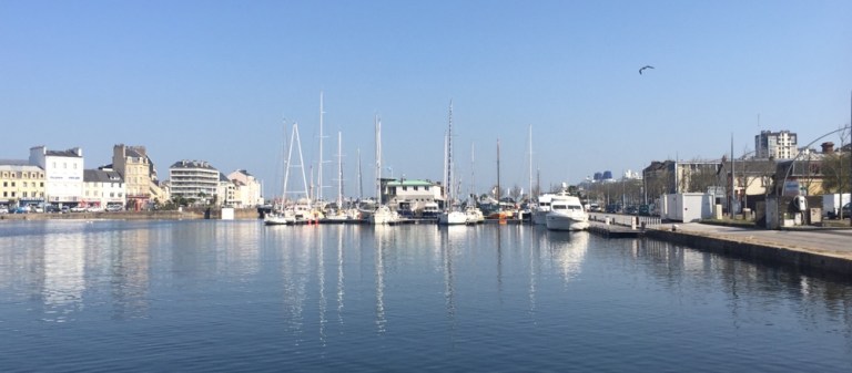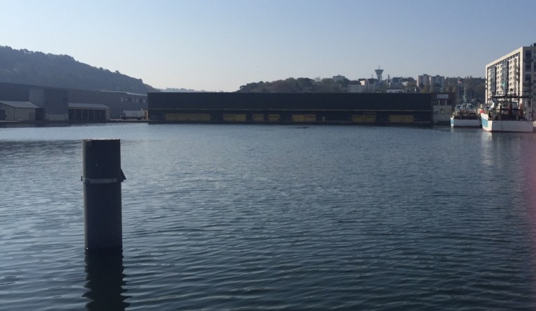 Muss kilometerweit zwischen dem abgezäunten Frachthafen und dem Schiffswerftgelände der CMN (https://de.m.wikipedia.org/wiki/Constructions_Mécaniques_de_Normandie) entlang nach Norden laufen.