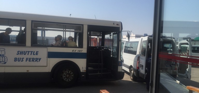 Kurz nach 16 Uhr erfolgt ein erster Aufruf. Passkontrolle, Gepäckkontrolle, die Scanner funktionieren leider grad nicht, also schaut der Grenzer kurz in jeden Kofferrein. Transferbus zur Fähre.