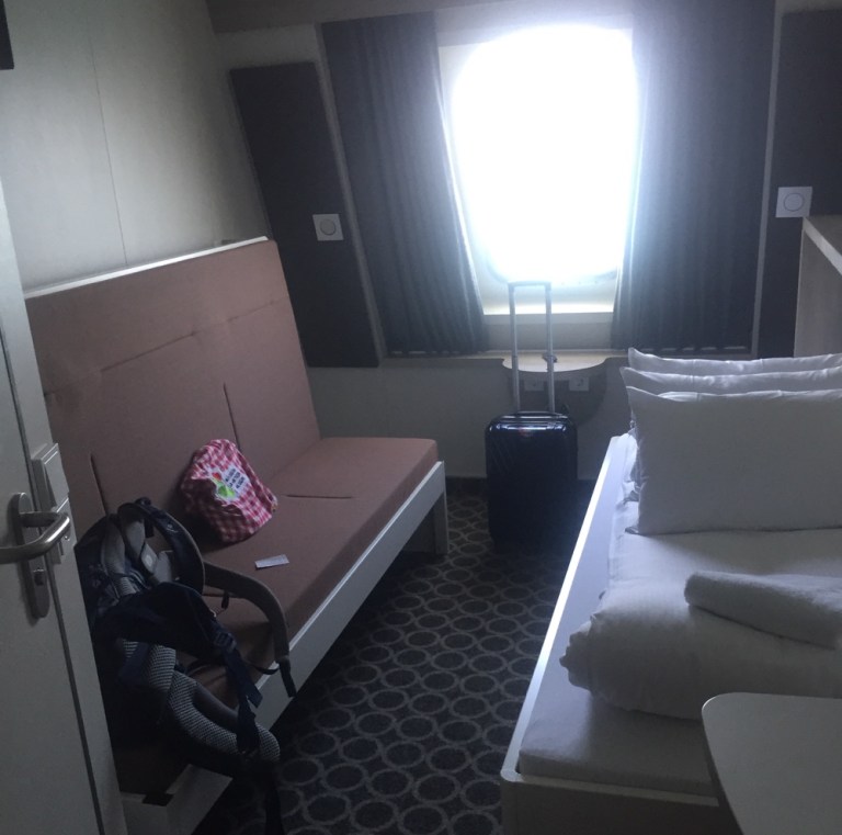 16.45 habe ich meine Kabine im obersten der 3 Bettendecks gefunden: 10. Stock, hinten raus. Kurz was Wärmeres anziehen, dann auf zur Schiffserkundung.